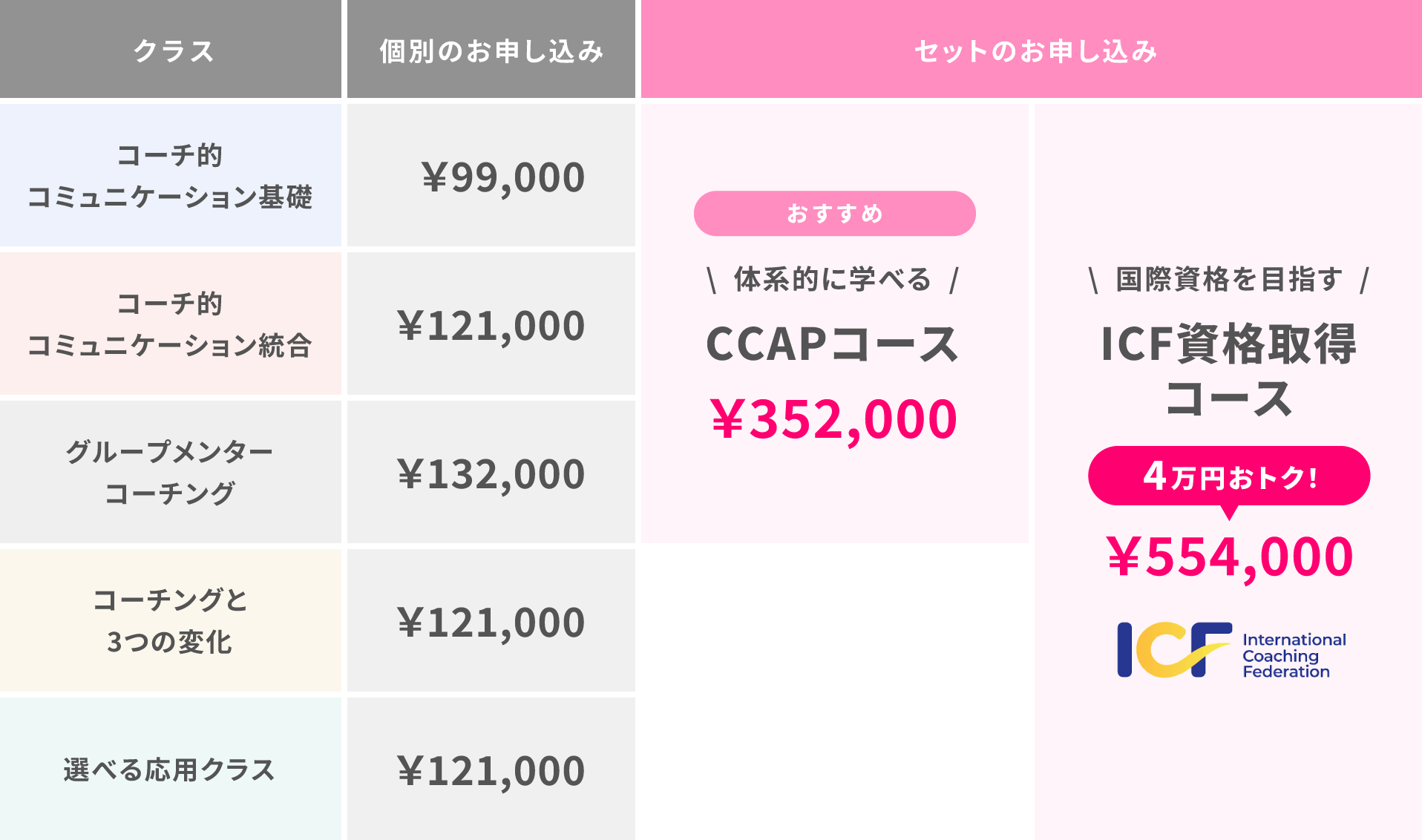 ICF資格取得コースでの受講と、コースに含まれる同クラス内容を単体毎に受講することでの内容の違いはございません。どちらもICF資格申請時のコーチトレーニング時間として申請可能なものとなっておりますので、ご安心ください。また、ICF資格取得コースに関しては、コース割引キャンペーン実施により単体での購入よりもお得になるケースがございます。皆様のご都合に合わせてコース、または単体でのご受講をお選びください。